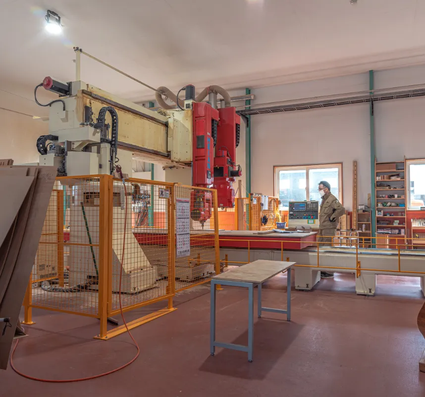 私たちは、長年の経験と実績に裏打ちされた信頼と技術力を誇る店舗什器メーカーです。 創業以来、一貫して自社一括生産体制を貫いてきました。外注に頼ることなく、木工、金属加工、ガラス加工、塗装など全ての工程を自社で行うことで、高い品質と確かな納期遵守を実現しています。 特に、完成品を一旦組み立て確認してからバラし、現場で再度組み立てるという徹底したプロセスにより、施工時間の短縮と設計通りの仕上がりを保証しています。このような確かな実力が、国内有数のブランドショップからの厚い信頼につながっています。 時代の変化に合わせ、化粧品コーナーなどの高級什器需要の増加にも対応すべく、イタリア製の最新ガラス加工機を導入するなど、常に先手を打った設備投資を行っています。
